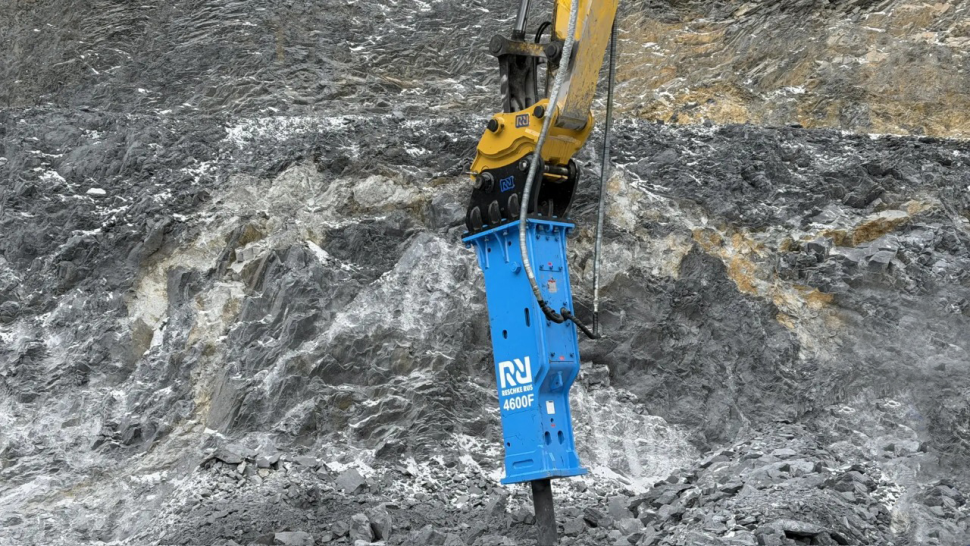 - Гидромолот Reschke 4600F с диаметром пики 165мм — мощный инструмент для разрушения твердых покрытий и горных пород.